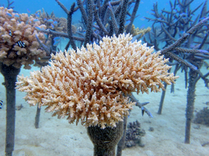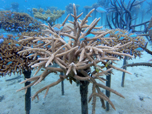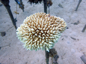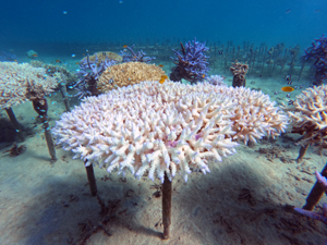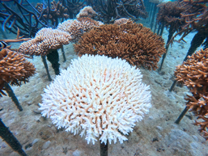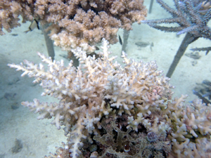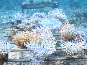 | 第1養殖場の白化状態。多くのサンゴが真っ白です。自然のサンゴも白くなっています。 |