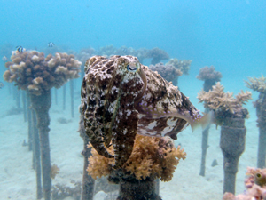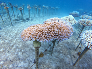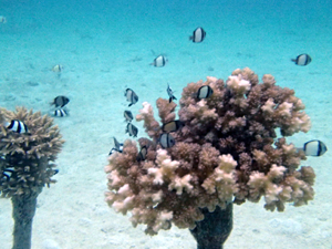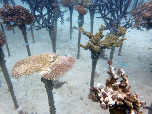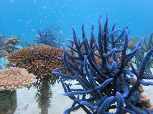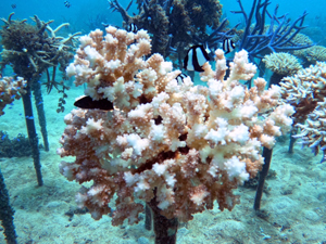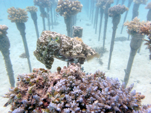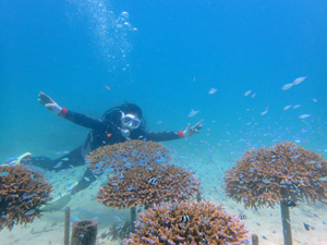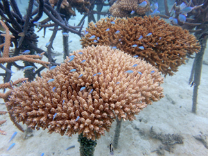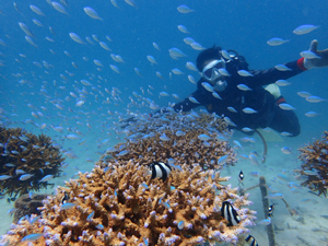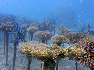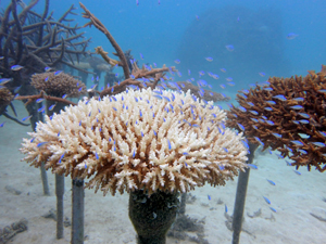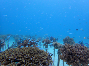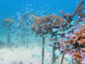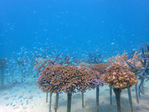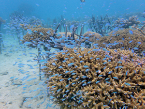 小さなサンゴには小魚(幼魚)たちが同じように集まります。養殖活動をしている中で育てたサンゴが大きくなるのはもちろん、多種の生きものが見られるようになるのも同じように嬉しい事です。 |