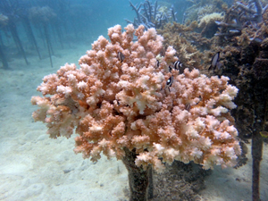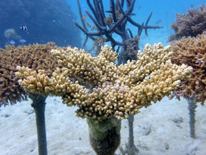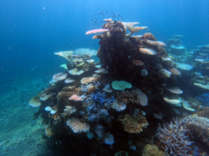 大きな個体は80cm以上まで成長。大きく成長したサンゴの周りには多くの生きものが集まり、一つの生態系が成り立ち始めました。 |