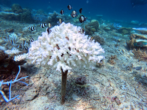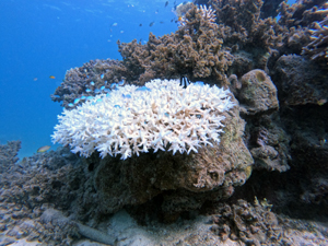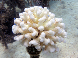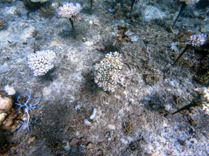 8月に起きた白化現象、いまだ直っていません。今回の白化で残念ですが多くのサンゴが死滅しました。まだ当面経過観察の必要ありです。 |