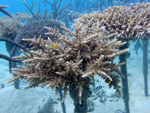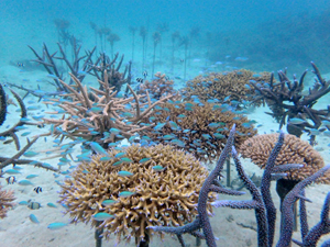 | 第3養殖場は最も大きな被害が出ています。養殖サンゴもそうですがサンゴ礁全体が白化しています。一見きれいに見えますが非常に深刻な状態です。 |