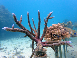 | 紫色が美しいマルヅツミドリイシ。先端が丸く筒状なのが特徴。右の画像は各種をそろえたレーン。形も様々で色とりどり、だいぶサンゴ礁らしくなってきた。 |