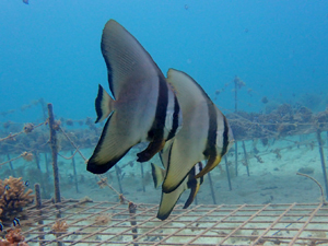 メンテナンスや植付の合間の一コマ。ツバメウオが作業台で休んでいました。たくさんの生きものが見られる養殖場。サンゴが増えると生きものも合わせて増えていきます。そんな観察をするのも楽しいです。 |