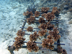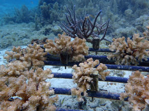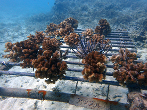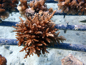 | 2023年3月1日 植付けから10ヶ月経過、水温21.8° 今回は白化が一番少なかった別の場所にある養殖場へ畑を大移動しました。少しでも影響を無くすための決断です。 無事生き残った苗たちをまずこの場所になじませ安定させていきます。 |