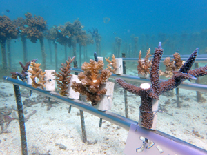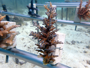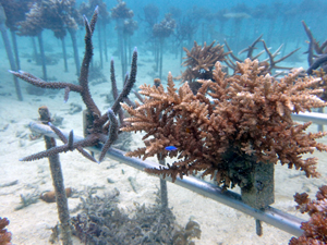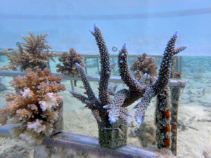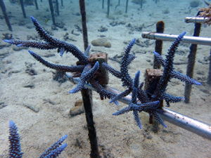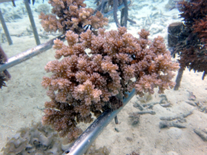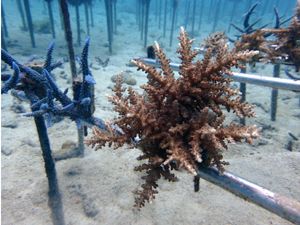 | 2024年11月20日 植付けから約1年8か月経過 今年は5月以降に大きな試練がありました。石垣島全域で大白化が襲いました。未だ白化から復活できなサンゴも多いです。当養殖場も影響を受け多くのサンゴが白化しました。畑もだいぶ影響を受けています。石垣全体の中でも当養殖場はまだましのようで他エリアは真っ白な状態です。 幾つか白化の影響で死滅した個体もありますが、耐え抜いて生き残った個体もあります。 下の画像で先が白っぽく見える部分が白化から復活中の部分です。全体的に白色でしたが、ここまで回復しました。11月に入り水温も下がり安定してきたので、ここからどんどん回復していく見込みです。生き抜いた苗はそんな中でも成長を続けさらに大きくなりました。まだ油断はできませんが、メンテナンスしながら見守っていきます。 |
