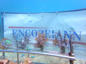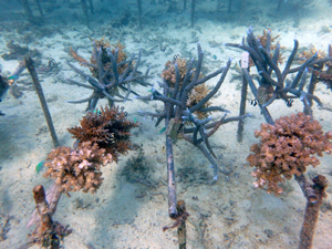 | 2024年5月21日 植付けから約1年2か月経過 生育順調です。今回はデバスズメダイが集まていました。サンゴの周りに魚が群れるとそれだけで畑らしくなります。 |