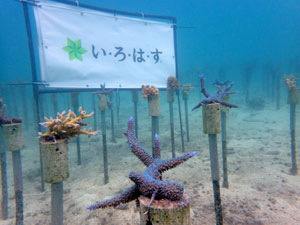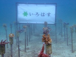 | 左側はダイバーにより苗を作っているところです。中と右は植付直後のサンゴたちです。 | ||
