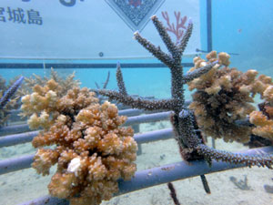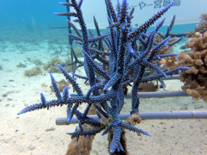 | 一番最初の植付から4年近くの歳月がすぎ、白化等を乗り越えよくぞここまで育ちました。最初は数本の枝しかなかったサンゴ達ですが、今では何本かわからなくなるまで成長し畑らしくなっています。この調子で頑張ってほしいですね。ますます今後が楽しみです! | ||