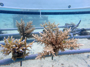 | 2022年12月19日 植付けから約9ヶ月経過 水温21.8° 今回は畑を違う場所へ移動しました。別の養殖場で今回の白化時最も影響が少なかったところです。 まずは移動した苗がこの場所で安定するまでまつ状況です。 |