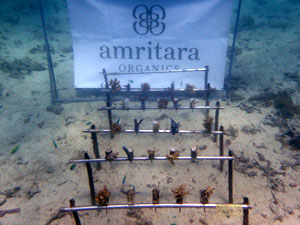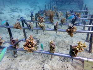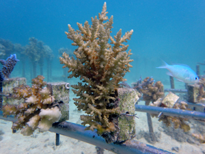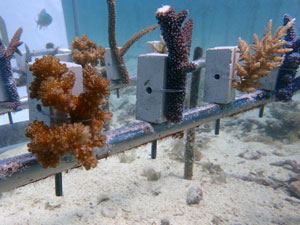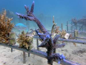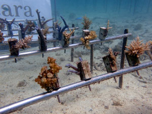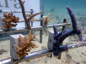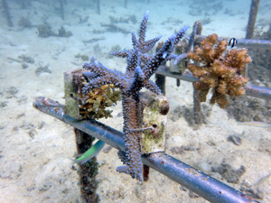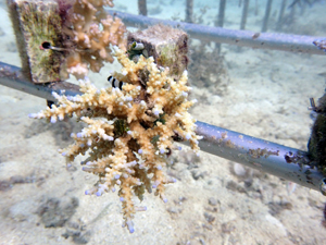 | 今回の植え付けでさらにサンゴ畑が拡大しました。大きくなっていくのが楽しみですね。下の2つの画像が、今回新規で植付したサンゴたちです。 | ||