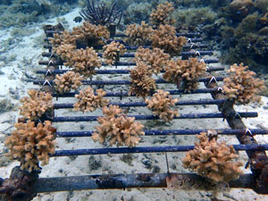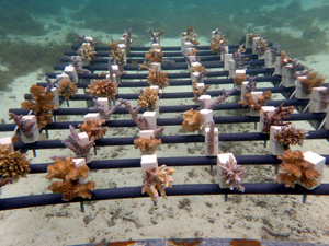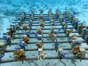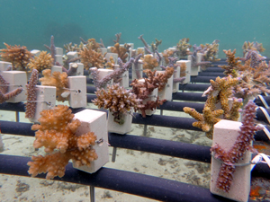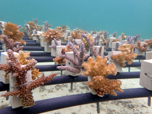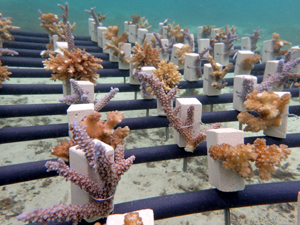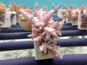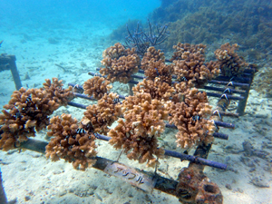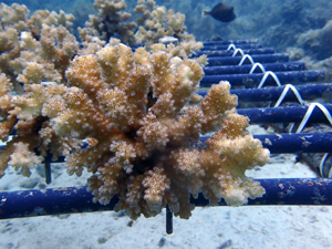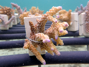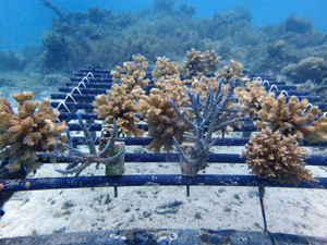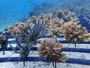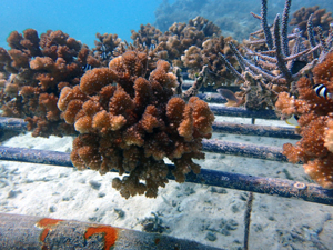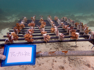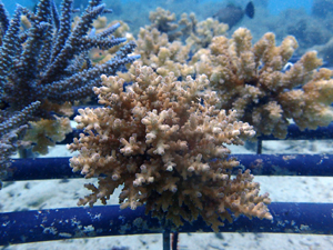 | 2023年3月1日 植付けから10ヶ月経過、水温21.8° 今回は白化が一番少なかった別の場所にある養殖場へ畑を大移動しました。少しでも影響を無くすための決断です。 無事生き残った苗たちをまずこの場所になじませ安定させていきます。 |