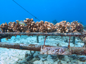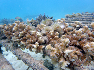 | 2022年10月17日 植付けから5ヶ月経過、水温26~28° 夏場に高水温になり石垣で白化現象が起こってしまいました。養殖場のサンゴも大きな影響を受け、多くのサンゴが白化。なんとか生き残ったサンゴもありますが、まだ白化が続いています。まずは安定するのを待つしかありません。 |