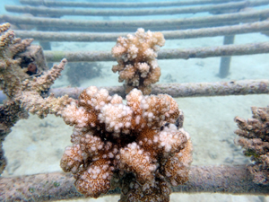 | 2022年10月17日 植付けから約7ヶ月経過 水温26~28.0° この夏、石垣で白化現象が起こりました。養殖場も大きな影響をうけ多くのサンゴが白化。なんとか生き残ったサンゴが頑張っています。 まだ安定せず白化が続いています。 |
