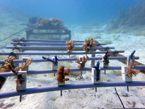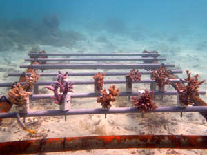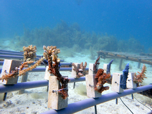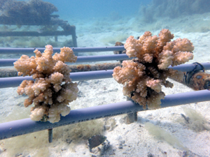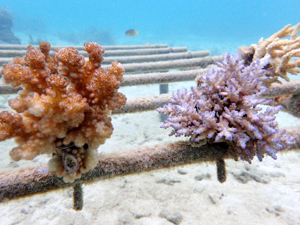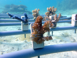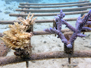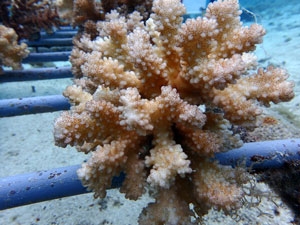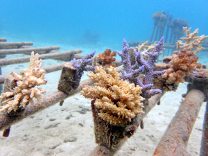 | 2022年5月14日 植付けから約2ヶ月経過 水温26.0° 順調に成長しています。これからが水温が上がり苦難の時期のためサンゴたちには頑張ってもらいましょう。 |