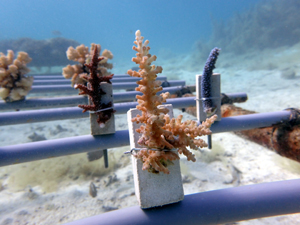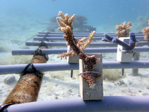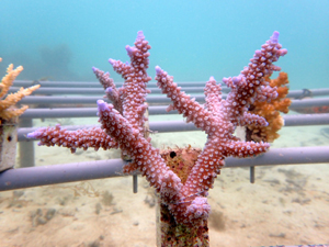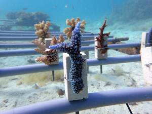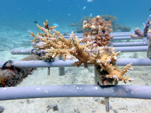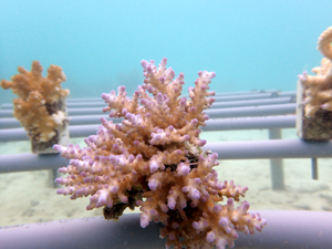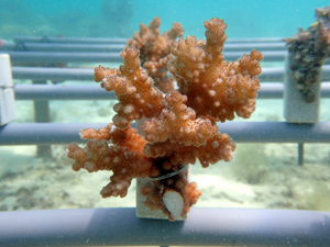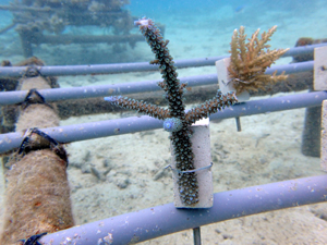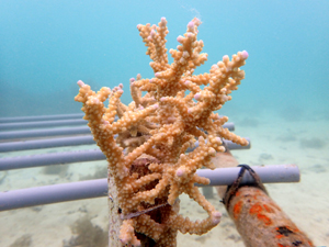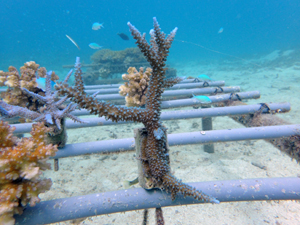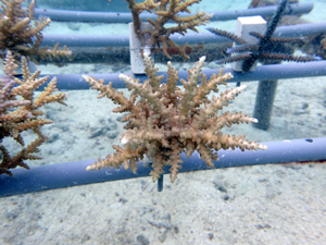 | 2022年12月19日 植付けから約9ヶ月経過 水温21.8° 今回は畑を違う場所へ移動しました。別の養殖場で今回の白化時最も影響が少なかったところです。 まずは移動した苗がこの場所で安定するまでまつ状況です。 |